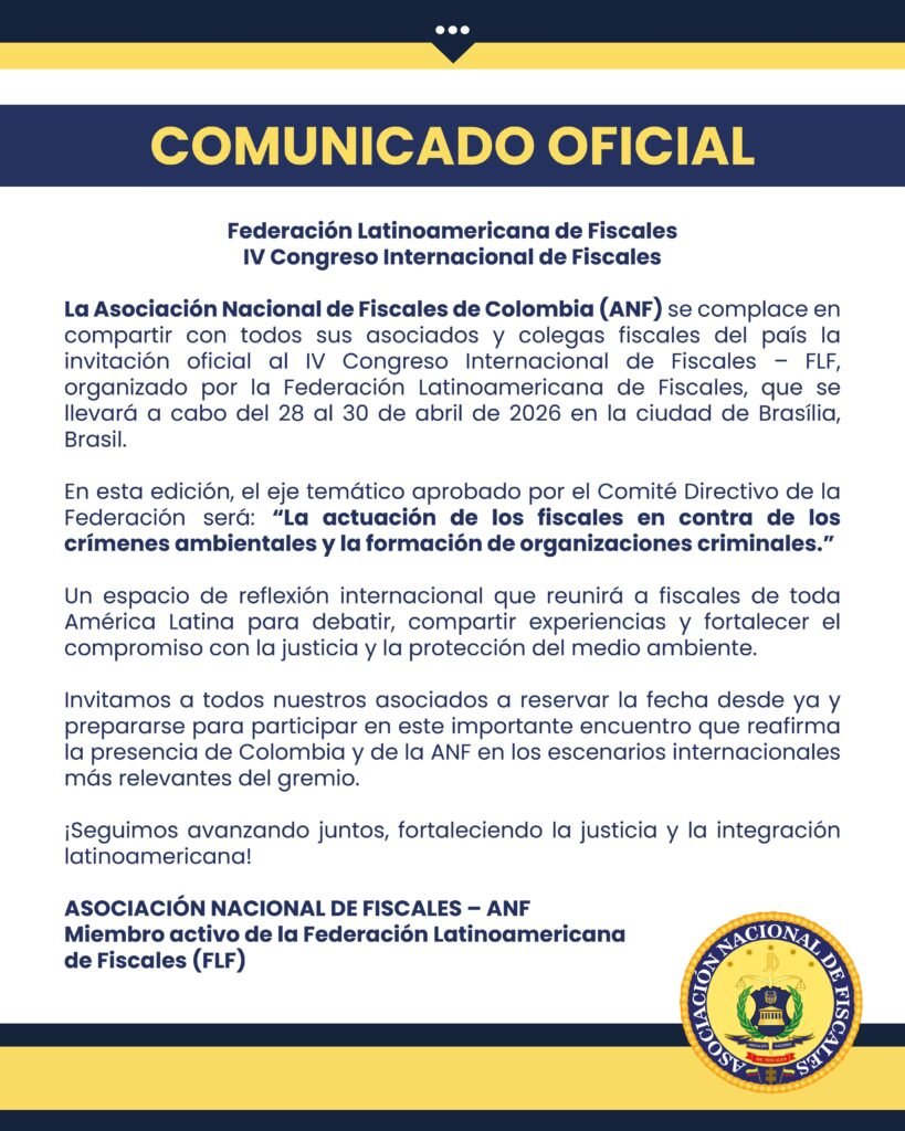 La Asociación Nacional de Fiscales de Colombia (ANF) se complace en compartir con todos sus asociados y colegas fiscales del país la invitación oficial al IV Congreso Internacional de Fiscales – FLF, organizado por la Federación Latinoamericana de Fiscales, que se llevará a cabo del 28 al 30 de abril de 2026 en la ciudad de Brasília, Brasil.